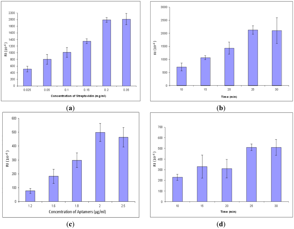 In order to obtain better signals and conserve reagents, the concentration and incubation time of streptavidin and aptamers were optimized. All procedures are the same in the concentration optimization except the concentration of streptavidin. The result for optimization of streptavidin concentration is shown in Figure 4(a). The response values increased gradually from 0.025 to 0.2 mg/mL, but after 0.2 mg/mL, the values became unchanged. The results showed that the optimal concentration for streptavidin for the SPR aptasensor was 0.2 mg/mL. After that, streptavidin incubation time was optimized by varying incubation time at a constant value of concentration. The optimal incubation time for streptavidin was 25 min (Figure 4(b)). Similarly, the parameters of aptamers were optimized, resulting in 2.0 μg/mL of optimized concentration (Figure 4(c)) and 25 min of optimized incubation time (Figure 4(d)).