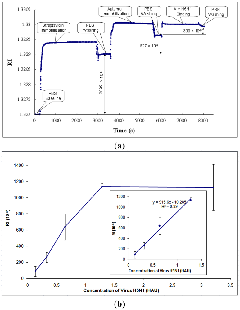 After parametric optimization, AIV H5N1 was detected as described in Section 2.4. A typical response curve of AIV H5N1 detection using SPR biosensor is shown in Figure 5(a). The PBS baseline is at the beginning of the curve, RI = 1.327. Then, streptavidin was immobilized onto the gold surface of the SPR chip, causing the RI to increase. In order to rinse off the excess streptavidin, PBS was applied to the chip surface, resulting in the stabilized RI value for streptavidin. The RI change caused by streptavidin was taken as the difference between the PBS baseline and the stabilized RI value for streptavidin (RI = 2,095 × 10−6, as shown in Figure 5(a)). Similarly, the RI changes caused by aptamers and AIV H5N1 were obtained by the differences between the stabilized RI values for aptamers and streptavidin, and the stabilized RI values for virus and aptamers, respectively.