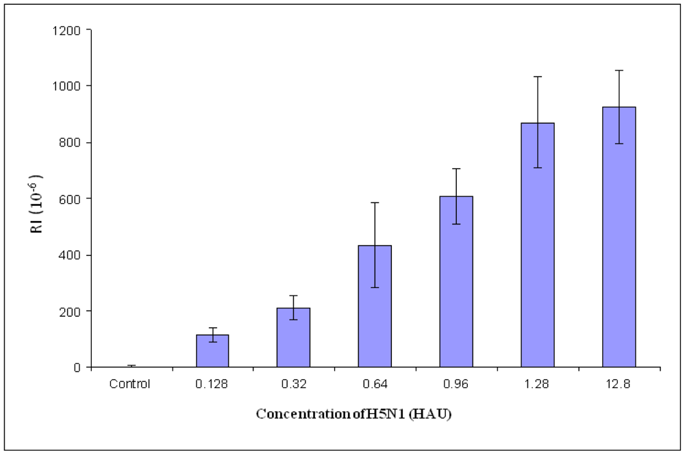 Based on the collected data, the RI value showed a great linear correlation (R2 of 0.99) with the concentration of AIV in the range from 0.128 to 1.28 HAU (Figure 5(b)). After the concentration of AIV became greater than 1.28 HAU, the signal tended to become constant (Figure 5(b)). The signals for concentrations of AIV of less than 0.128 HAU were not detectable. The value of RI for AIV at 0.125 HAU was more than three times any noises, including non-target AIV subtypes, thus, the detection limit [41] for this biosensor was 0.128 HAU. The calibration curve of H5N1 detection was obtained and is shown in Figure 5(b).