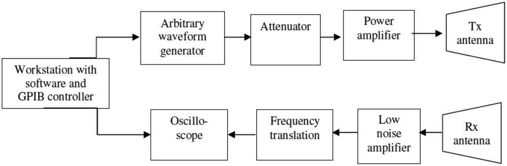 Figure 1 shows the block diagram of the multimodal radar. The arbitrary waveform generator (AWG) enables generation of chirp waveforms of different bandwidths. The AWG operates at a maximum rate of 4 GSa/s, making it possible to generate waveforms of frequencies up to 2 GHz. The test-bed radar also includes amplifiers, transmitting and receiving antennas, and a high-speed oscilloscope for recording the received signal. The frequency spectrum of the transmitted signal lies within the 1,000–1,640 MHz band. Frequency translation is performed to downconvert the received signal from the 1,000–1,640 MHz band to the 300–940 MHz. The oscilloscope samples and records the return signal at 4 GSa/sec. The return is processed by software which decides whether further processing is required and what bandwidth waveform must be used for the next pass, if any. A workstation with a GPIB controller makes it possible for the software to control the AWG and the oscilloscope. Hence, the radar is capable of automatically making decisions about additional processing and required bandwidth. The radar system parameters are as shown in Table 1.