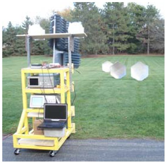 Field measurements were performed for a number of different scenarios. The measurement setup is shown in Figure 10. Trihedral corner reflectors with square faces of length 0.6096 m (2 ft) were used as targets whose computed RCS ranged from 57.8 m2 (+17.6 dBsm) at 1 GHz to 155.5 m2 (+21.9 dBsm) at 1.64 GHz. We consider a range of 37.5 m which is slightly greater than the maximum radar range. This results in 10 LRR gates each of extent of 3.75 m. The RCS values of the targets are normalized with respect to the target with the highest RCS. The algorithm continues with higher resolution passes until 3-dB separations are obtained between the peaks and their neighboring cells.