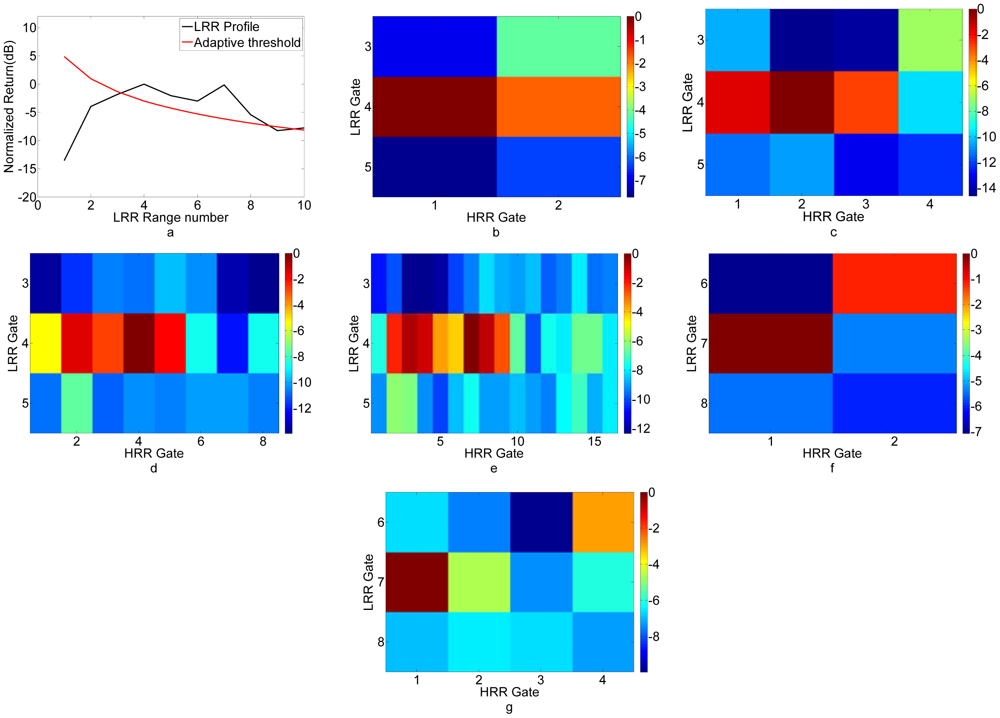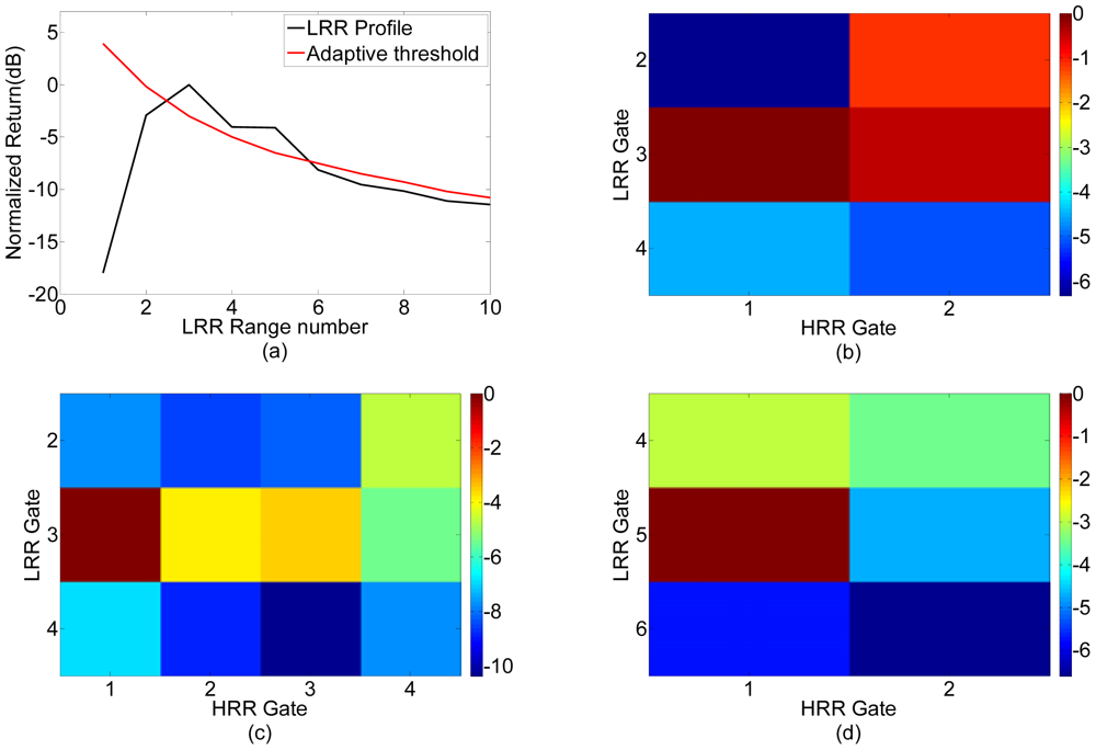 Initially, the AWG transmits a low bandwidth waveform (40 MHz) and sweeps the range extent searching for targets generating low range resolution profiles. Range resolution ΔR is given by c/2B where c is the speed of light and B is the bandwidth [21]. Thus, a bandwidth of 40 MHz corresponds to a range resolution of 3.75 m. The return is compared to an adaptive range-dependent detection threshold to obtain the LRR gates with a high probability of the existence of potential targets.