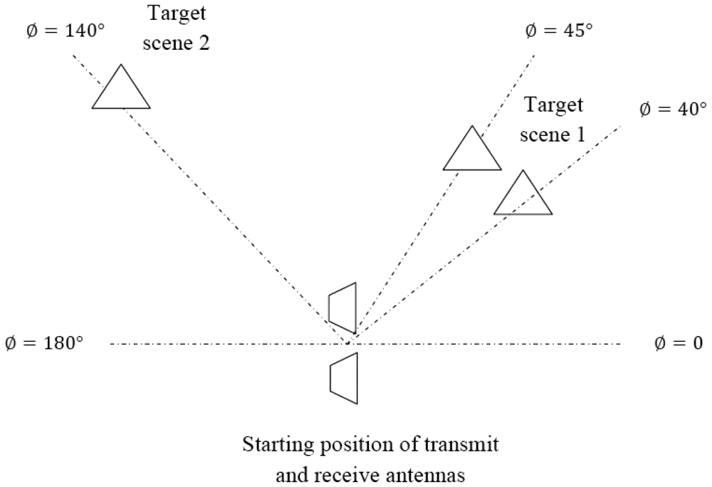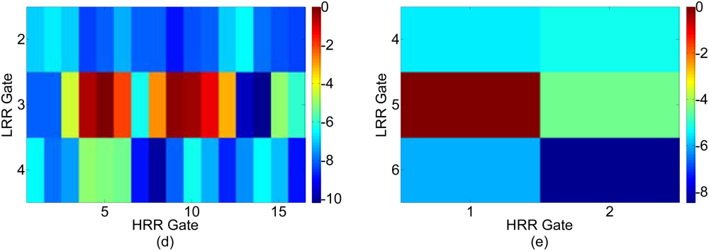 Table 8 lists a Target Scenario 6 consisting of two target scenes. It is shown diagrammatically in Figure 13. LRR profiles are taken while the antennas are rotated with a step-size of 15°. The targets are correctly picked out from the LRR tracks and the multimodal algorithm is applied to these. The HRR images for these target scenes are shown in Figure 14. For target scene 1, LRR Gate 3 contains two targets separated by 1 m. HRR passes 2 and 3 are not able to resolve these targets, as shown in Figure 14(a,b). However, the two targets are discerned in HRR passes 4 and 5 in Figure 14(c,d). For target scene 2, HRR pass 2 is able to resolve the single target in LRR gate 5, as shown in Figure 14(e). This illustrates how the multimodal radar can be used to scan an area for targets and use only as much bandwidth as absolutely required.