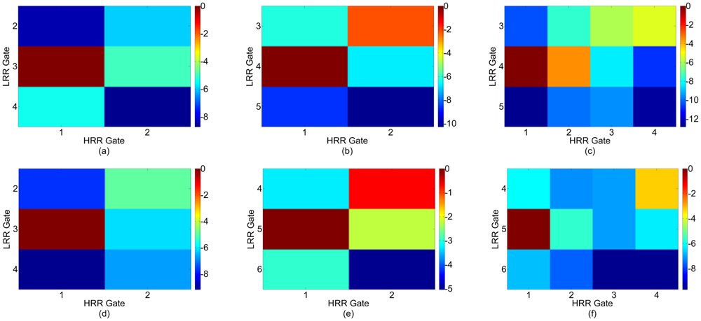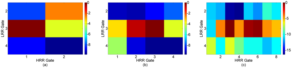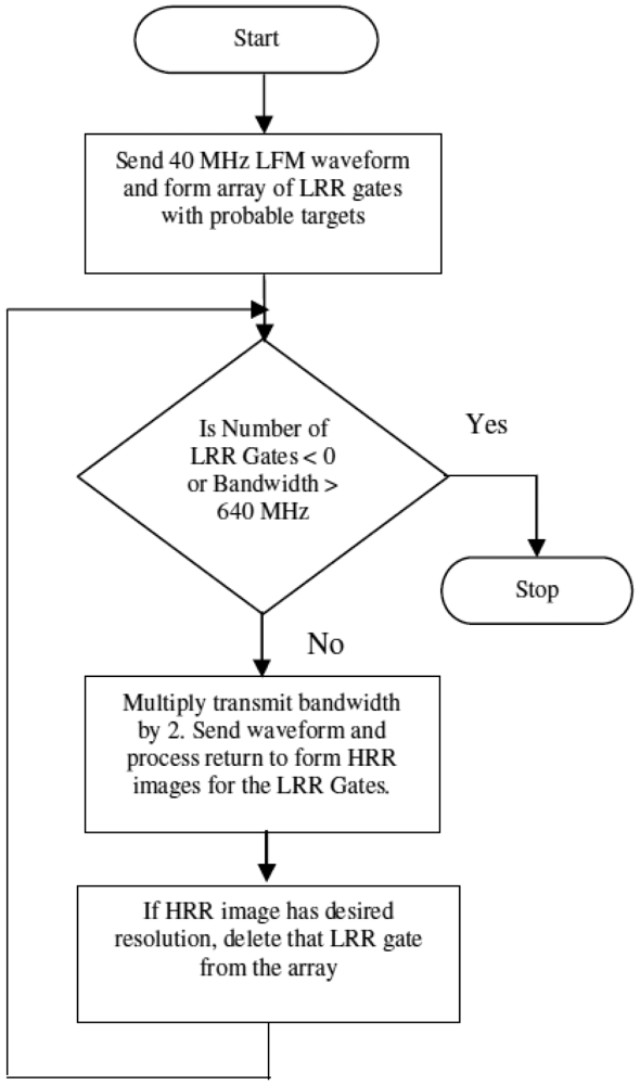 Figure 2 shows the flowchart for operation of the multimodal radar in staring mode, i.e., with stationary antennas. It is assumed that the frequency band of 1–1.64 GHz is available for use. LRR gates are identified using a LFM waveform of bandwidth 40 MHz. Then the bandwidth is increased in powers of 2 until the desired resolution is obtained for each HRR profile. The simulation may require different number of passes for different LRR gates. The multimodal radar makes efficient use of the spectrum, utilizing lower bandwidths initially, and using the higher bandwidths only if required. This leaves the unused bandwidth available for use in other applications.