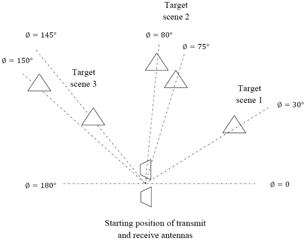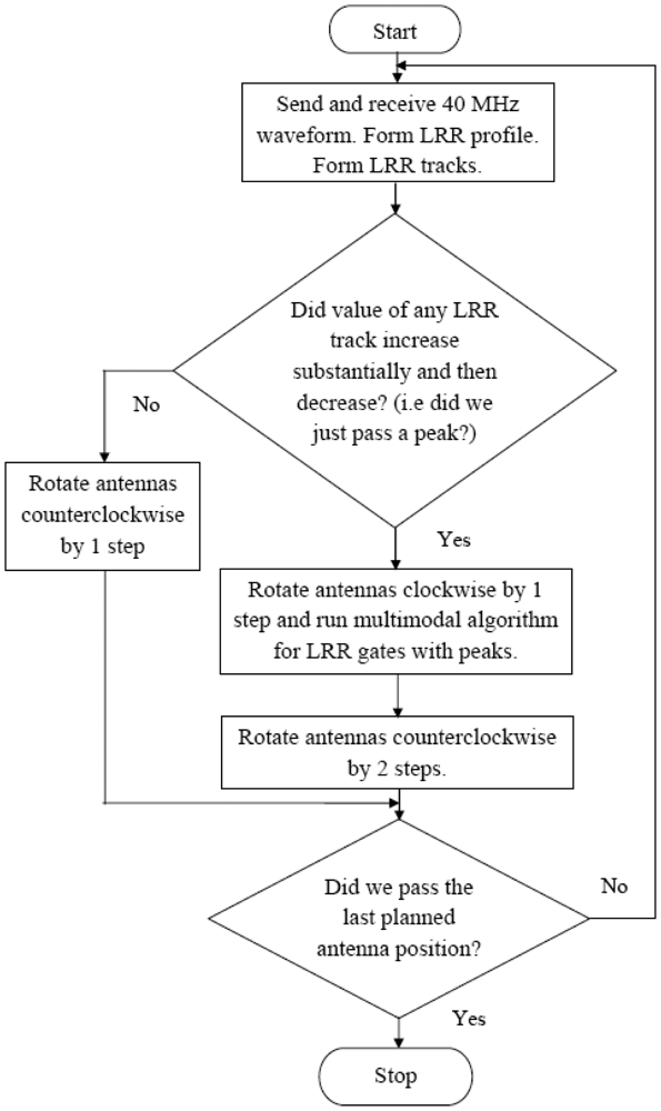 Measurements were also taken for scenarios where multiple target scenes are laid out in azimuthal fashion. The radar starts scanning the field for targets (by rotating the antennas about a vertical axis) beginning with the low bandwidth waveform. The first LRR profile is taken at φ = 0 and subsequent ones are taken after rotating the antennas counterclockwise each time by a fixed angle, henceforth referred to as one step. The LRR profiles are stored to form LRR tracks for each LRR gate. When the radar detects that a peak has just been passed, the antennas are rotated clockwise (in the opposite direction) by one step to run the multimodal algorithm on the target scene. Figure 3 shows the flowchart for operation of the radar when scanning in this fashion. The antennas are mounted on a plate which can rotate in the azimuthal plane. The entire setup is automated so that the scanning process can operate without any user intervention.