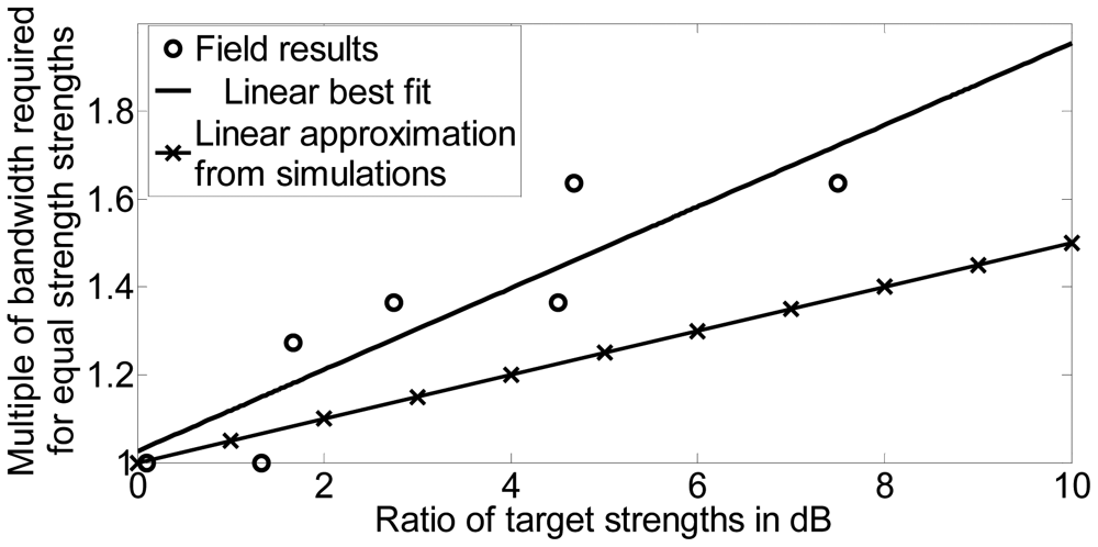 Field data were acquired to study the variation in bandwidth required based on difference in target strength. Multiple corner reflectors were placed side by side to increase the resultant RCS. Table 10 shows the various target scenes and the bandwidth required for each scene. Note that the RCS of second target is normalized with respect to its strength and distance compared to the first target. The results are plotted as shown in Figure 17. The linear approximation derived from simulation results, i.e., the line corresponding to Equation (5) is shown. The results from the field are shown and a best fit line is drawn. Clearly, the field results demonstrate that higher bandwidth is required to resolve two targets as the ratio of their strengths increases. Hence our theoretical results in this regard are justified. We did require slightly more bandwidth in the field compared to the simulation results. This may be due to the fact that we are using multiple corner reflectors to act as a single target leading to a broader response and hence requiring more bandwidth for 3-dB separation. Effects such as ground reflection also result in a wider response than a point target. Also, since multiple corner reflectors are placed side by side, the gain of the antenna would vary for the different reflectors. Furthermore, some of the response of the farther reflectors is masked by the reflectors in front.