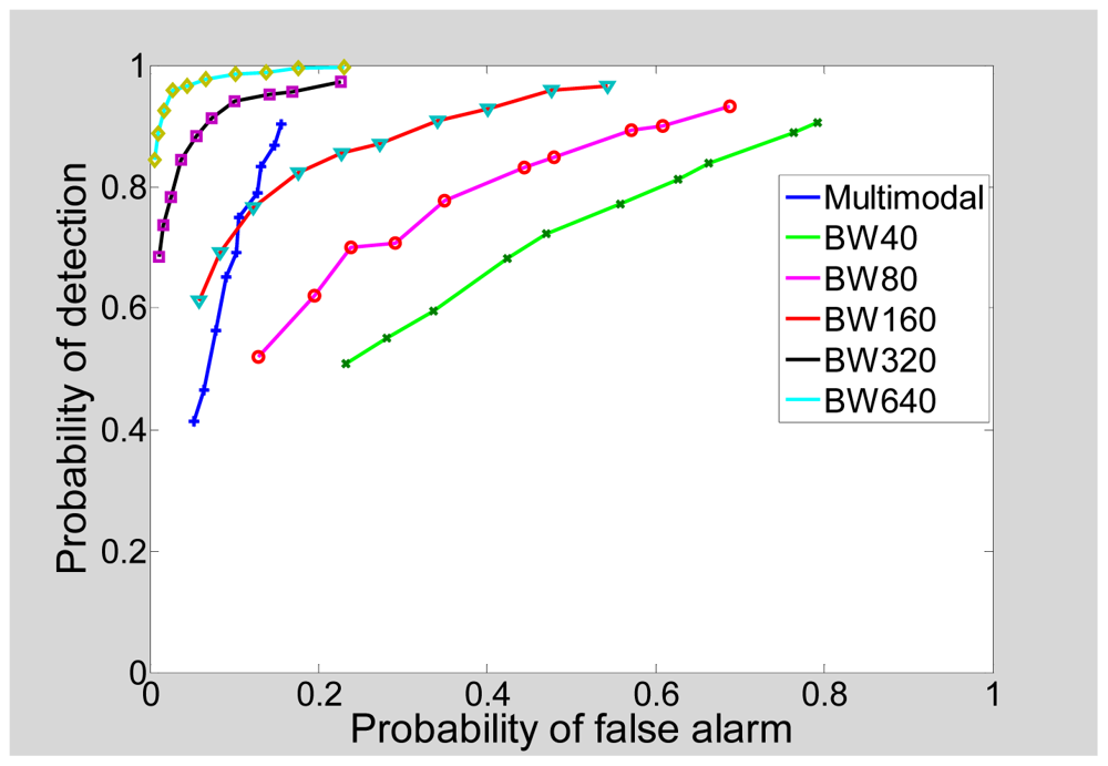Simulations were performed to generate the receiver operating characteristics (ROC) curves for the multimodal radar. The probability of detection (Pd) and probability of false alarm (Pf) for a multimodal radar can be defined as shown below: