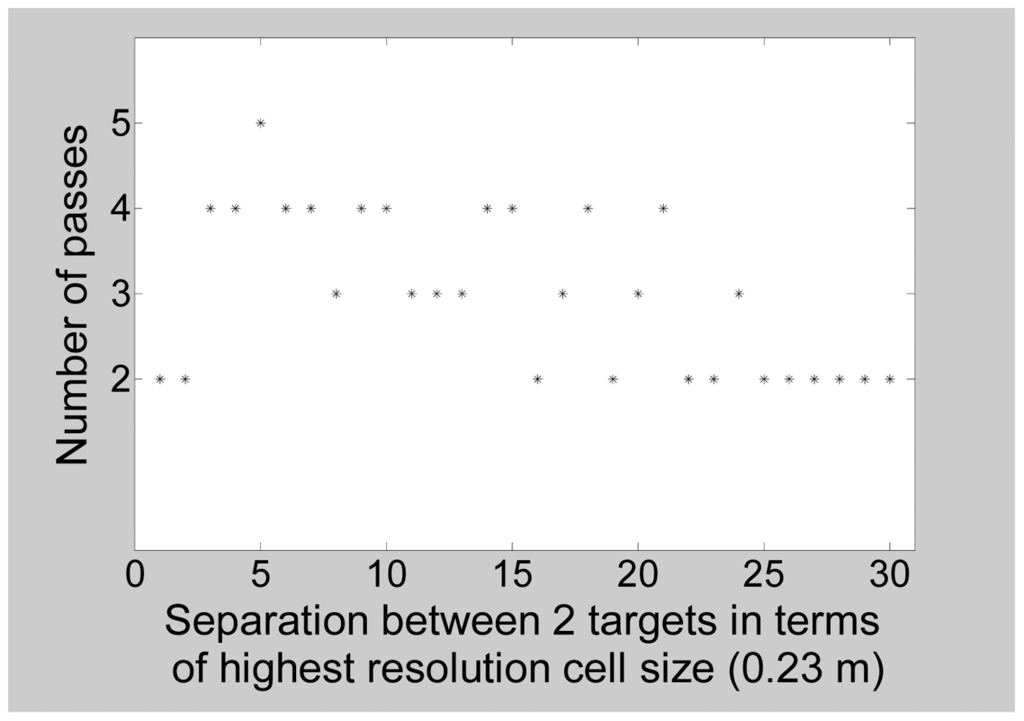 We explore the effect of separation between the targets. We consider two targets and note the number of passes required as the separation between them is gradually reduced. The result is plotted in Figure 20 where the X-axis is in terms of the highest resolution cell size (0.23 m). The number of passes required generally increases as the separation between the targets is reduced. Hence more bandwidth would be utilized as the distance between two targets is reduced. This suggests that as the target scene becomes more intricate, the multimodal radar would require more number of passes. The number of significant peaks observed in Pass 2 HRR images can also provide an indication of an intricate target scene. An important consideration is whether an attempt should be made to skip some intermediate bandwidths and directly advance to a higher bandwidth for such target scenes. Figure 20 shows that when the target separation was too low, the multimodal radar took only two passes. This happened because in Pass 2, the two targets appeared as a single target.