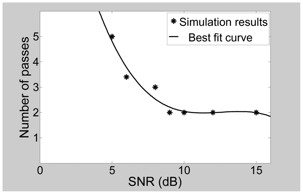 We also simulated the effect of signal-to-noise ratio (SNR) on the performance of the multimodal radar. The target scenario was kept the same while the SNR was varied. It was observed that a higher number of passes is required to resolve a target scene as the SNR is decreased. The result is plotted in Figure 21. This follows from the fact that better separations are obtained between the peaks and their neighboring cells at higher SNRs. As the SNR reduces, more passes are required to get adequate separation. At high SNRs, the number of passes levels off to a value of two for the scenarios under consideration, and starts to dip at an SNR of 15 dB. It is possible that for certain scenarios at high SNR values, a single pass may be adequate to resolve the target scene.