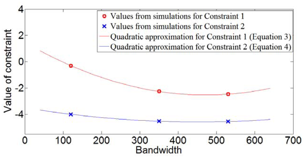 A Target Scenario 1 is shown in Table 3. There are two targets separated by 2.5 m. A range resolution value of 2.5 m or better will be able to resolve the two targets, but this is only assuming that the point spread function is an ideal impulse. In reality, the point spread function is usually a Gaussian or a sinc-function having energy beyond its 3-dB point, which may cause a larger target to obscure a closer but smaller target. Thus, to be on the safe side, a resolution value of half of the minimum target separation is used to ensure capturing targets of all sizes and make target identification possible. Thus, in this case, a resolution of about 1.25 m would be ideal. Simulations were performed to find sample values for the constraints. From three values obtained by simulations, convex quadratic functions were approximated, as shown below, respectively: