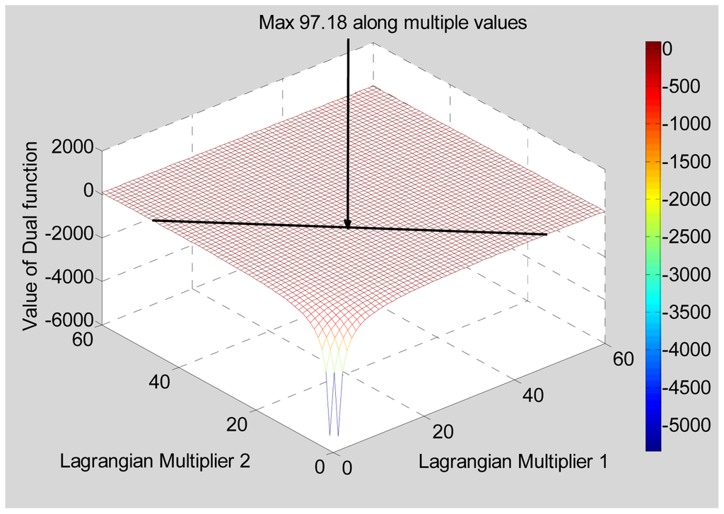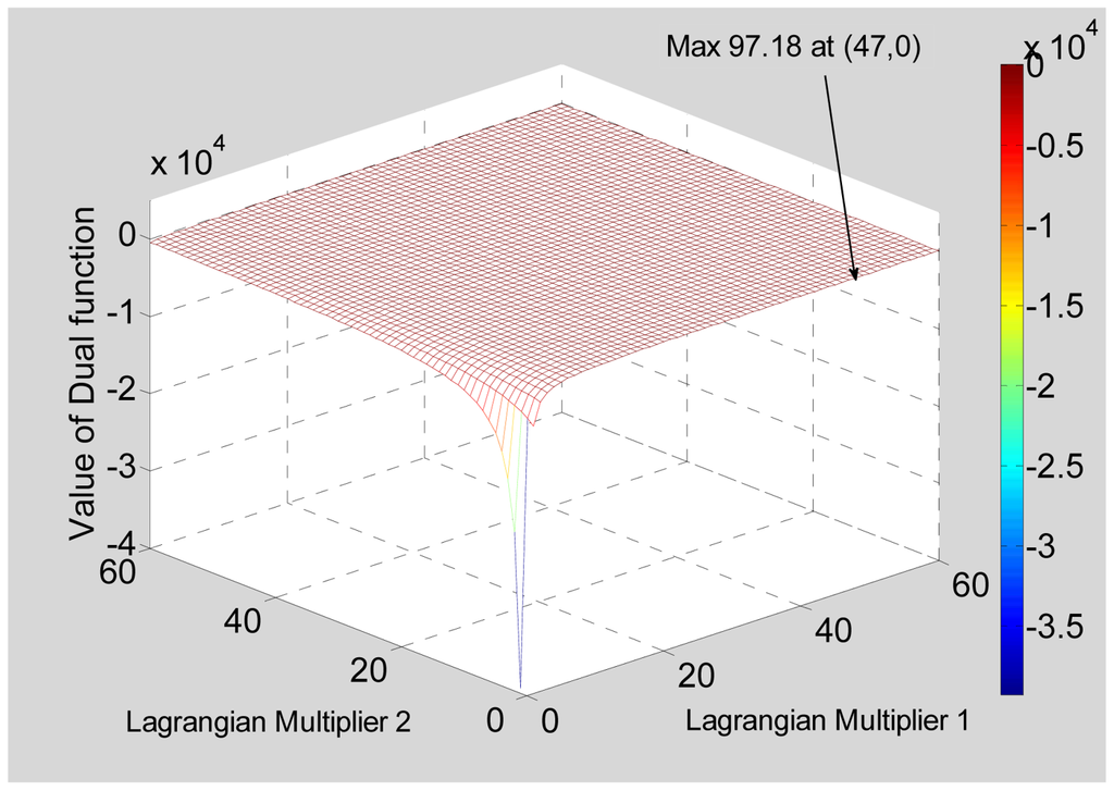 The dual function was obtained and its values for different values of Lagrangian multipliers are shown plotted in Figure 5. The maximum of the dual function has a value of 97.18 MHz, which corresponds to a range resolution of 1.54 m. This is close to the desired 1.25-m resolution, indicating that our technique works well.