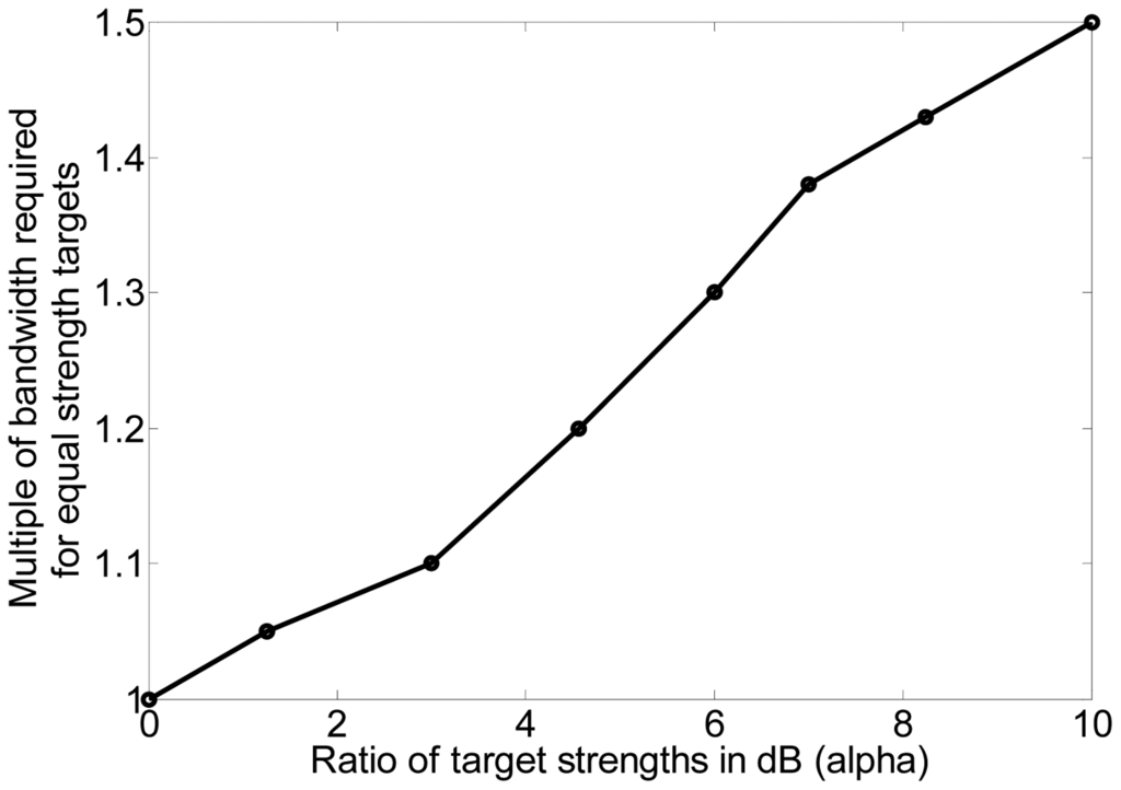 For the previous discussion, we assumed that the targets were of equal strength. However, if the targets vary greatly in strength, a resolution value of half of the target separation is no longer accurate. In [20], the effect of both bandwidth and the difference in target RCS on range resolution was examined. We carried out simulations to find a relationship between the strength difference α (in dB) and the bandwidth requirement. This is plotted in Figure 8 and it can be seen that the relationship is almost linear. The ratio of target strengths is expressed in dB. The change in bandwidth is expressed as the multiple of bandwidth required for equal strength targets. Since the bandwidth increases by 50% (0.5) for a 10-dB increase in α, the slope of the straight line approximation is 0.5/10 = 1/20. Hence, for targets of unequal strength, the bandwidth optimization problem can be stated as: