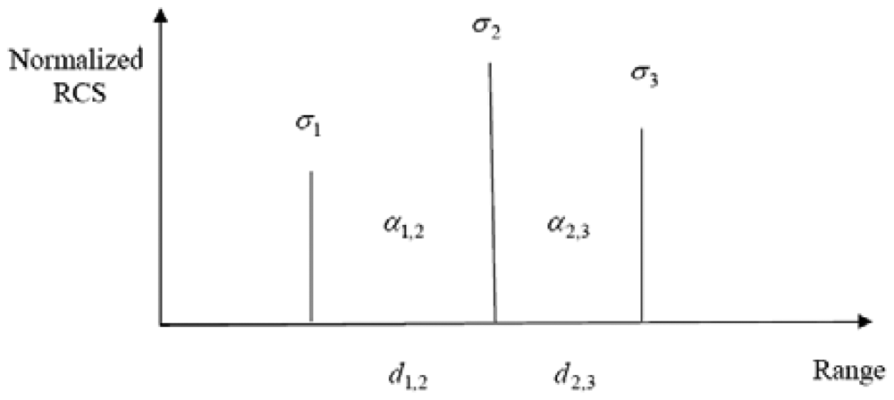 Let us consider an arbitrary target shown in Figure 9 and calculate the bandwidth required for its detection. For each pair of adjacent scattering centers, we take the ratio of the RCS of the stronger one to the weaker one to get α in dB. We separately look at the bandwidth required for resolving each pair of adjacent scattering centers. Let us first look at the pair (σ1, σ2). We approximate the expected value of bandwidth based on the theory of point spread function. If σ1 and σ2 were equal, the resolution required would have been approximately d1,2/2. This corresponds to a bandwidth of β1.2 = c/d1.2. When σ1 and σ2 are unequal, this can be adjusted to be equal to: