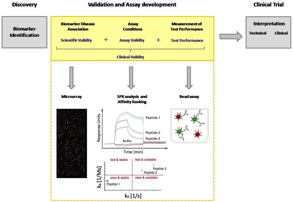 Today, immunoassays are the fundamental method of protein analysis and have gained importance as powerful tools in basic and applied proteomic research. Immunoassays have their origin in the 1950s, when Berson and Yalow developed the first immunoassay for insulin, using radioactive labeled antibodies for detection [21]. To avoid radioactivity, in 1971 Engvall and Perlmann introduced an alkaline phosphatase conjugated antibody for detection that displays the classical detection principle of an ELISA (Enzyme-linked immunosorbent assay) [22]. In the late 1980s, Ekins, the founder of multi-analyte immunoassays, conceived the “Ambient-Analyte-Theory” and discussed the application of a parallelized microspot immunoassay in immune diagnostics [23,24]. His theoretical examinations and his experimental work demonstrated that simultaneous microspot immunoassays can be carried out with classical ELISA. Through miniaturization, a greater sensitivity and selectivity, as well as a higher throughput can be achieved. However, Ekins' theory gained even more importance after the development of DNA chip technology in the 90's, which coincided with the worldwide breakthrough of biochip technology [25]. The innovation of advanced equipment such as pipette robots, spotters and fluorescence readers allowed the production of microarrays with thousands of microspots, as well as the sensitive and high-resolution detection of bound target molecules. Since DNA microarrays are a well established tool in molecular biology, several groups have used this technology in order to immobilize proteins instead of DNA on the arrays [26,27]. Those arrays are miniaturized immunoassays used for protein or antibody detection from complex media. The rapid rise of immunoassays in protein analytics, combined with the development of protein arrays, and later peptide arrays as multiparametric immunoassay, illustrates the enormous potential of this technique in diagnostics. Within the last decade, multi-analyte immunoassays have led to the identification of a huge number of biomarkers from serum, particularly new antigens, and to the elucidation of disease progress. However, the current limitation is the validation of biomarker candidates. One of the major challenges in biomarker validation and diagnostic assay development is the availability of high-quality capture molecules, e.g., antibodies. Several efforts have been seek for the assortment of well-characterized affinity-based molecules, not limited to antibodies, in one database [28,29]. But also different other aspects of the entire validation process need to be improved. Technologies like MS and ELISA currently used for biomarker discovery and validation are not able to achieve the combination of high throughput with high measurement accuracy and precision. Compared with traditional ELISA, multiplex arrays have several advantages, including their high-throughput nature, requirement for smaller sample volume, efficiency in terms of time and cost, the ability to evaluate one antigen in the context of multiple others and the ability to reliably detect different proteins across a broad dynamic range. Multi-analyte immunoassays are excellently suited for the entire biomarker discovery process. During the validation procedure biomarkers must be identified and the disease association must be explained as well as the assay conditions must be defined before moving with that candidate in clinical trial (Figure 1). Hence, a clinical study is expensive, time-consuming, and a consumption of rare patient samples should be prevented. The group of Peter Nilsson pointed out the potential of staged proteomic profiling of serum by using a combination of different affinity-based methods. They had also considered the primary problem of biomarker analysis: the establishment of efficient throughput methods for validation of large generated datasets. Larger studies are needed to investigate the protein expression with the help of independent microarray platforms, and to finally overcome the inherent throughput limitations of Western Blot and ELISA. This dual confirmatory approach allows large-scale cross platform analysis and validation of antibody performance under assay conditions [30].