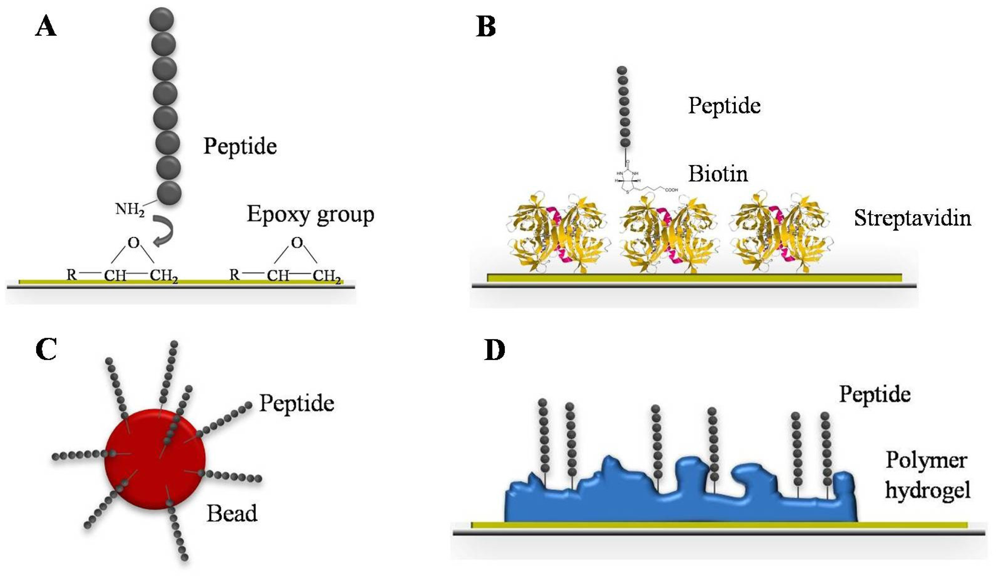 Glass slides often function as solid supports on which thousands of different capture molecules can be immobilized. Since tiny amounts of sample volume (reaching up to several nanoliters) per microspot are deposited, special liquid handling robots are required. Those are often constructed for the purpose of the DNA microarray development. Nevertheless, the spotting of purified proteins or peptides is much more challenging. They are more chemically diverse than DNA and their stability and functional nature on the array have to be ensured. An alternate approach to spotted proteins is the Nucleic Acid Programmable Protein Array (NAPPA) that circumvents the technical limitations of protein spotting. It is constructed by spotting protein-encoding plasmid DNA on an array surface and the proteins are subsequently generated using cell-free expression systems. Thus, the NAPPA platform allows functional protein studies including protein-small molecule, protein-protein, protein-nucleic acid, and also antigen-antibody interactions [32]. NAPPA microarrays were used to detect autoantibodies in human sera of breast cancer patients to p53 antigen and to GAD65 antigen in type 1 diabetes patients [33]. Dependent on the microarray application, several covalent or non-covalent immobilization strategies for capture probe binding are established (Table 1). These microarray substrates have to fulfill two major requirements to achieve maximal immobilization efficiency: It is important that the substrates provide high binding capacity and preserve the capture probe in an active state [34].