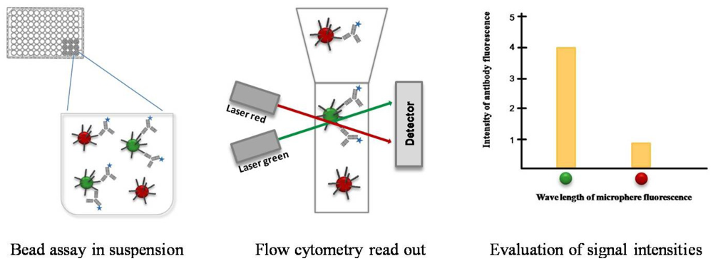 These microspheres can consist of a variety of different materials, like color-coded beads or magnetic particles with different diameters. In comparison to location coded microarrays, whose capture probes are printed in picoliter volume pointwise onto the supporting material, a liquid handling robot is not imperatively needed for bead assays. Since bead assays are usually performed by using standard laboratory equipment, i.e., using microtiter plates and a flow cytometer. The individual capture probes on the microarrays are detected as illuminated spots, depending on their location on the array surface. In the case of bead-based systems, the differentiation of capture molecules occurs with a color-coding of the beads. The color coding of the beads offers the potential of multiplexing. Depending on the number of different colors, each bead population can be coated with another capture probe that allows the binding and detection of specific analytes from a serum sample. A mixture of color-coded beads that have bound the antigen are incubated with a serum sample in a cavity of a microtiter plate (Figure 3). Serum antibodies with the corresponding paratope recognize and bind to the antigen. The higher the concentration of corresponding antibodies in the sample the more antibodies can bind to the beads. The detection of the bead-bound antibody-antigen-complex occurs with help of secondary fluorescent-conjugated antibodies. The spectral range of the antibody fluorescent dye differs from this of the internal microsphere dye. Thus, the classification of the beads (red, green) and the quantification of the signal intensities caused by the detection of antibody-antigen complex (blue) can be simultaneously read out by a flow cytometer. The outcome of the multiplex antibody-antigen reactions are displayed fully automated in the analysis software. The Luminex xMAP technology has become the most popular bead assay platform and belongs to one of five assay platforms available to serologically diagnose the West Nile Virus infection [48]. This bead assay consists of 100 different bead populations, each of them with two fluorescence dyes in 100 different coding ratios which are used for multiplexing. Via the fluorescence coding of the bead populations, a specific labeling is assigned for every immobilized molecule species.