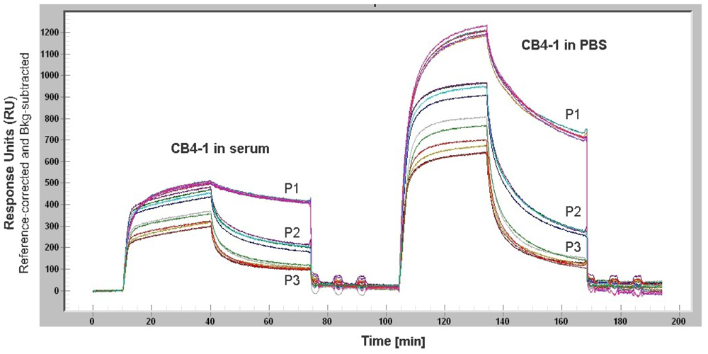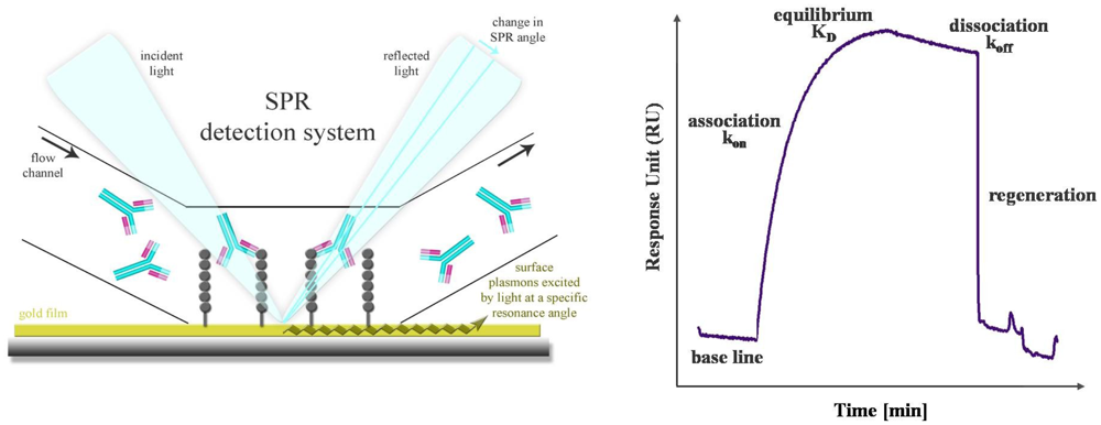 SPR is a powerful technology to study label-free antibody-antigen interactions in real time. Particularly, high-content microarray-based biosensors are well suited for diagnostic screening of serum samples, epitope mapping and protein expression profiling [60]. The SPR phenomenon occurs when polarized light passes the interface of a high-refractive-index material (prism or grating) and a low-refractive-index medium (analyte). The light beam is completely reflected by a thin gold film. Another component, called the evanescence wave, passes into the gold film, where plasmons are excited. Thus, a resonant wave is transmitted and the intensity of the reflected light is decreased. Mass absorption by analyte binding to the capture probes on the gold surface leads to local refractive index changes. This causes a change in the SPR angle which is visualized as Response Units (RU). The progress of interaction is displayed in a sensorgram, a plot of response units against time (Figure 4). Conventional SPR systems have a few flow chambers, a maximum of four to six. As a result, only a limited number of analytes can be simultaneously measured. Serum screening is only possible if a small set of antigens is used. Nagel et al. restricted their SPR studies for serological detection of Lyme borrelioses to two widely used antigens. The whole proteins as well as two peptides, representing immunodominant domains, were used as capture probes [61]. But in general, different flow chambers have different antigens, and a direct comparison of kinetics and affinity ranking of more than four interactions is not practicable. De Boer et al. used a SPR platform that combines the microarray principle with SPR detection in one flow chamber. Thus, all SPR analyses were performed on a single array. The microarray contained 144 different glycans derived from the human parasite Shistosoma mansoni and was used for the simultaneous detection of glycan-specific serum antibodies [62]. Differences in the anti-glycan antibody repertoire from sera of S. mansoni infected patients, as well as uninfected controls were monitored. Moreover, differences between the antibody classes that responded to the infection were also revealed. A SPR biosensor was used to detect antibodies directly from human blood serum against the immunoreactive peptide epitope of EBV nuclear antigen. The results, yielded with this biosensor, were characterized in terms of reproducibility, detection limit and regeneration and compared with a conventionally used ELISA [63]. The reproducibility of the SPR sensor was obtained by using the standard deviation of the sensor response of different sensor chips and was determined in the range of 8 and 18% dependent on the serum antibody concentration. For the corresponding ELISA the inter-assay standard deviation was found to be between 5 and 20%. Thus, the reproducibility of the SPR sensor is comparable to that of an ELISA. The detection limit was estimated to be 0.1 ng/mL, which is lower by an order of magnitude than the detection limit of ELISA. The regeneration procedure was optimized and a minor loss of sensitivity was observed after 10 measurement cycles. This demonstrated the clinical relevance and the potential of the SPR sensor for usage in EBV diagnostics.