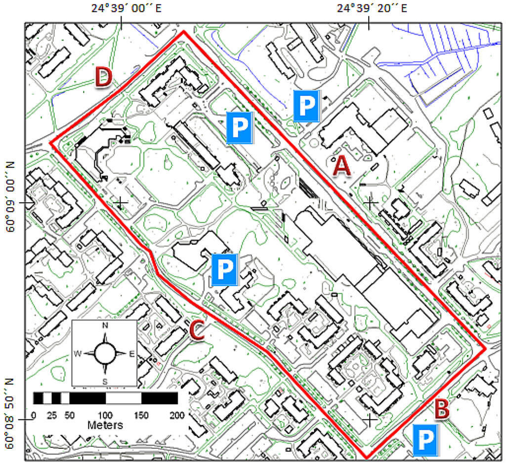 The test field was implemented in Espoonlahti, about 16 km west of Helsinki. The test field covers one block around the Lippulaiva shopping mall covering 1,700 m of road environment (Figure 1). The test field was divided into four sections separated by intersections as shown in Figure 1. GNSS visibility from Sections A, B and D is good, although some trees and higher buildings may restrict the visibility of lower satellites. As can be seen from the digital surface model in Figure 2, Section C has large trees standing close to the road, thus making the GNSS conditions far more challenging. There are many types of buildings and other constructions, such as stairs and walls, in the area, as well as hundreds of pole type objects, such as lamp posts, traffic signs and trees. The road area, as well as most of the terrain close to the road, is very flat in Section A. The other sections are more variable in regard to terrain elevation, both on the road area and in the surroundings. The height difference between the lowest and highest points along the road is 12 m (Figure 2).