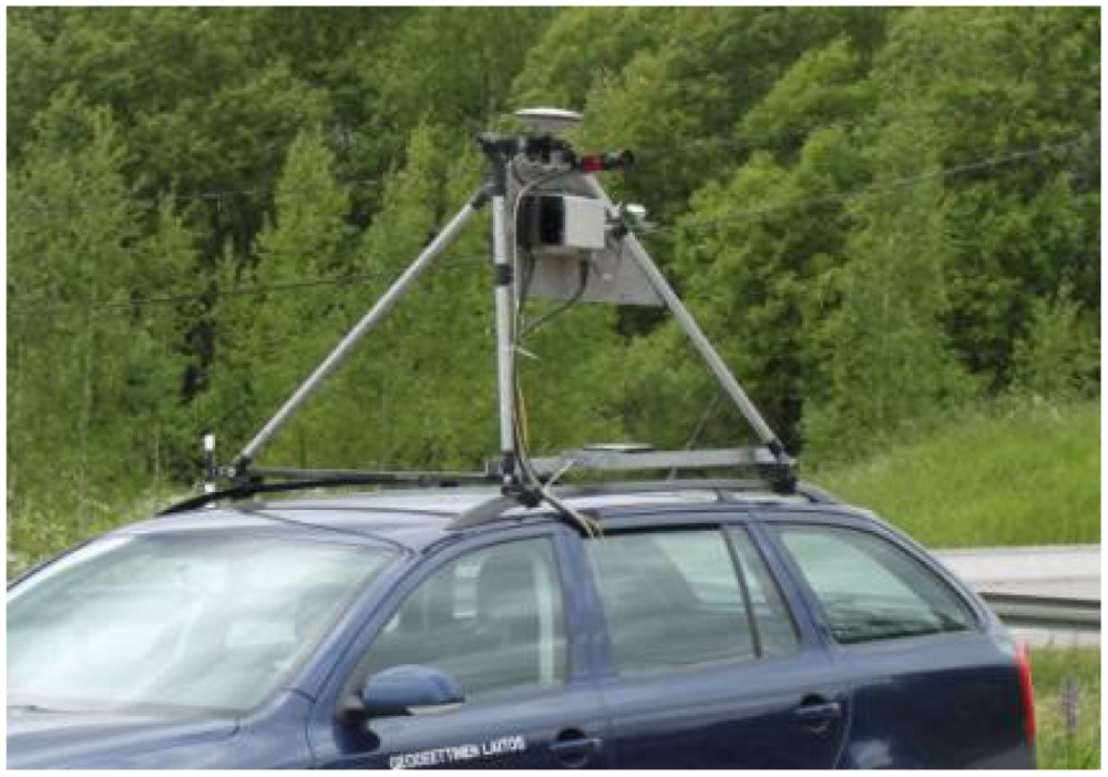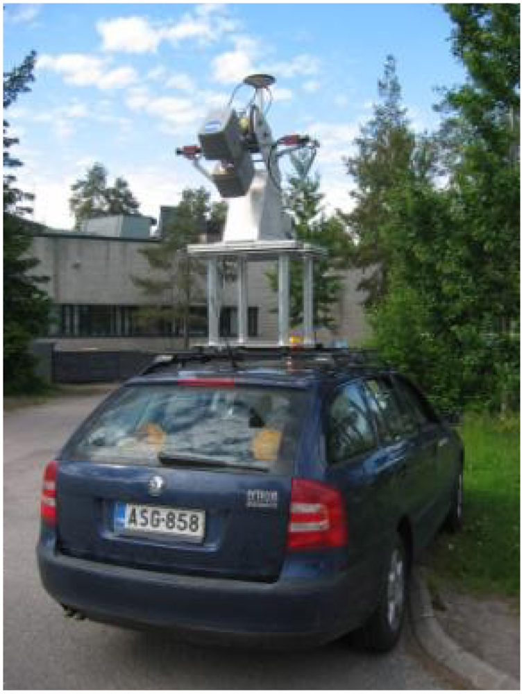 Dense terrestrial laser scanner point clouds were used to obtain the reference targets for the analysis of geometric accuracy. The reference point clouds were collected on 7 May 2009 using FGI's mobile mapping system called the ROAMER [11], Road Environment Mapper in static mode. The ROAMER was installed on the roof of a car, and the car was kept standing static on the road during each 360° scanning performed using of the FARO Photon 80 terrestrial scanner (Figure 3). The scan resolution was set to 0.0013 rad point separation. The georeferencing of individual scannings was computed during post-processing: the scanner position and heading were obtained from the ROAMER's SPAN navigation system and the scannings were leveled using the scanner's built-in inclinometer. The virtual GPS reference station data used in GPS post-processing were downloaded from the GPSNet.fi service. The SPAN data were processed using the Waypoint Inertial Explorer software, which gave the estimated accuracies of 11 mm in 3D-position and 0.027° in heading (RMS) for the ROAMER's inertial measurement unit (IMU) during the measurements. The offset between the IMU and the scanner origin, as well as the offset between the SPAN and the scanner heading, were determined during system calibration.