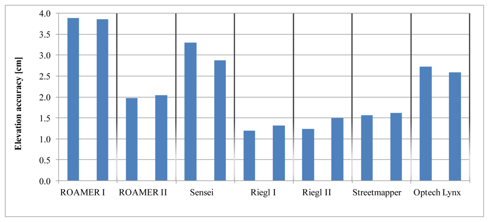 The results of the analysis of elevation accuracy are shown in Table 3 and Figure 15. Two results are given for the ROAMER and the RIEGL, Column I before fine-tuning and Column II after fine-tuning (see Section 2.1.3 for details).