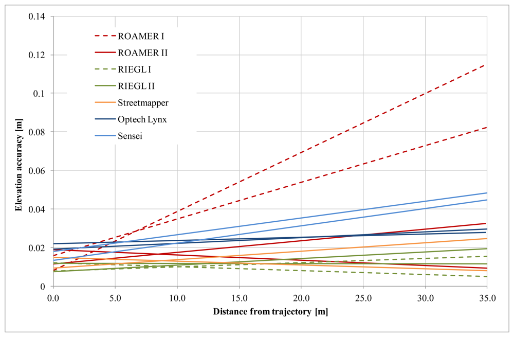 Even though Figure 16 suggests that the elevation accuracy improves in some cases when the distance from the trajectory increases, this is unlikely to be so. This phenomenon is most propably caused by the accuracy of the reference data having reached its limits and not being available for analysis of sub-centimeter accuracy. Nonetheless, this proves that the elevation accuracy of the best MLS systems can reach values of 1–2 cm up to a range of 35 m.