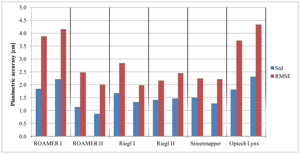 The results of analysis of planimetric accuracy are shown in Table 4 and Figure 17. Two results are given for the ROAMER and the RIEGL, Column I before fine-tuning and Column II after fine-tuning (see Section 2.1.3 for details).