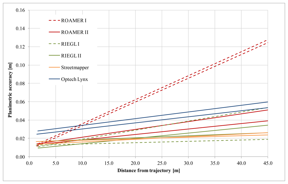With properly calibrated high-end MLS systems, the planimetric accuracy in good GNSS conditions is high, and in the present study it was within the limits of the used reference data accuracy, i.e., about 2 cm. Accuracy deteriorates as the distance to the trajectory increases, but very moderately, when the system calibration is in order.