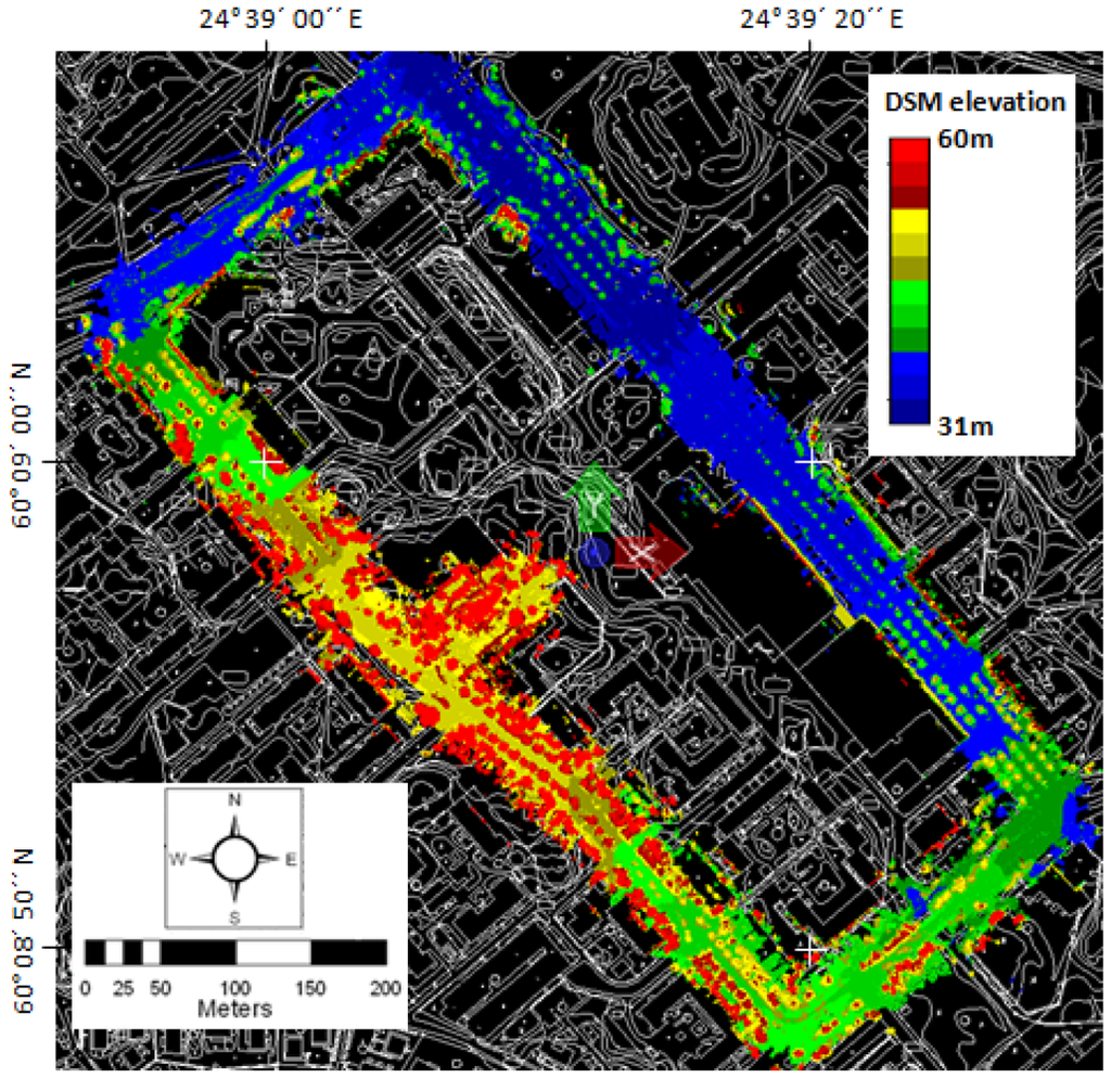 The direct georeferencing of the ROAMER point clouds was computed using the Waypoint Inertial Explorer™ GPS-IMU post-processing software. The GPS reference station data were acquired from the Finnish virtual reference station (VRS) network GPSNet.fi. After georeferencing, the dark points were deleted by filtering out points with intensity value of less than 8,000 (range 0–20,470), and isolated points were deleted by filtering out points that had less than 50 points within a 2 m radius around them. TerraScan by Terrasolid Ltd was used for the filtering.