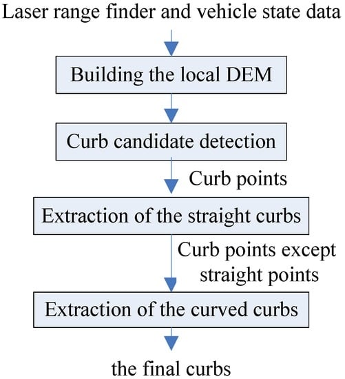 14]. According to the idea of curb detection, such algorithms can be divided into two classes: one idea is that range data is processed individually per frame and the algorithm can obtain curb candidate points, then the curb points are tracked using the filter method, such as Kalman filter and Extend Kalman filter; the other idea is that the algorithm extracts ground surface or obstacle-free area in a local map to obtain local curb information.