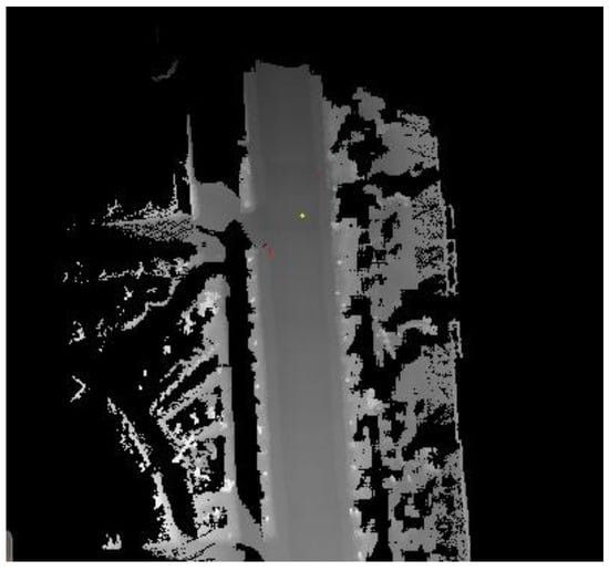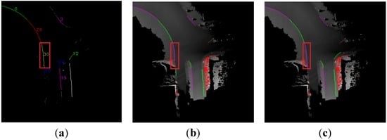 Figure 13(b), the two red rectangles are some wrong results in the result of accumulated curb candidates. The left wrong result was caused by the missing data so the algorithm actually detected the roadside vegetation. The right wrong result was caused by the process of building the DEM due to the interference of the moving vehicle. In this situation, the difficulty of the curb detection increased, but the proposed algorithm can detect the left straight curb except for the region of the missing data.