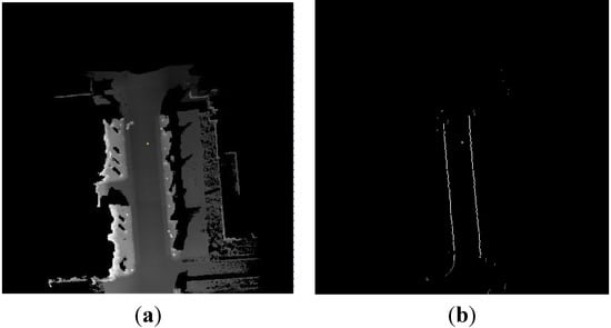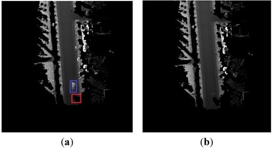 Figure 13(a). Because the moving vehicle partly occluded the left road curb, missing data appeared in