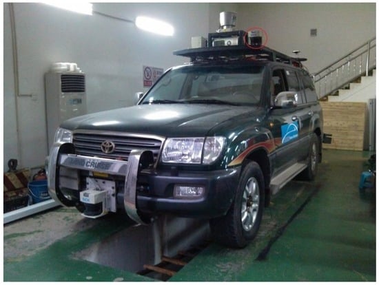 The experimental platform is a light off-road vehicle. A forward-looking laser range finder is mounted on the front top of the vehicle and tilts down a little, and it is shown in the red ellipse area in
