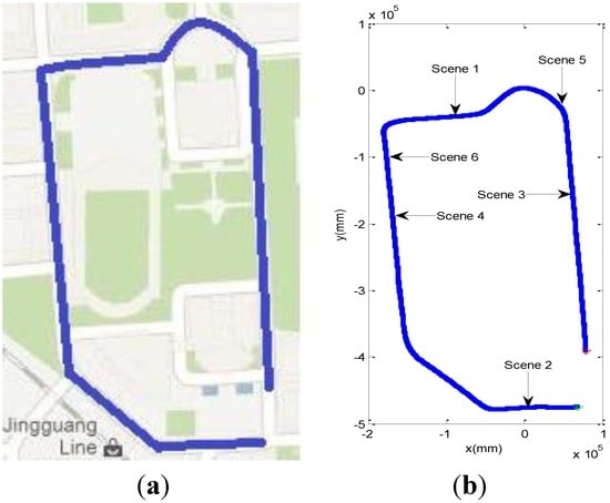 Figure 10(b). The red point denotes the start point of the vehicle, and the green point denotes the end point of the vehicle. The experimental results of six scenes will be introduced respectively in the following.