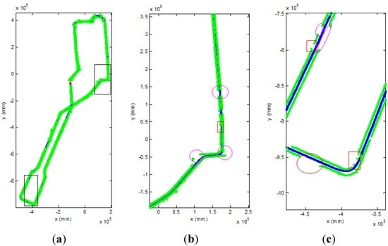 Figure 17(b,c), respectively. The blue lines denote the route of the vehicle, which are recorded from the navigation system of our vehicle, and the green points denote the detected curb points. The red rectangles and the purple ellipses denote the lost curb areas and the no curb areas which usually are the intersections on the road in