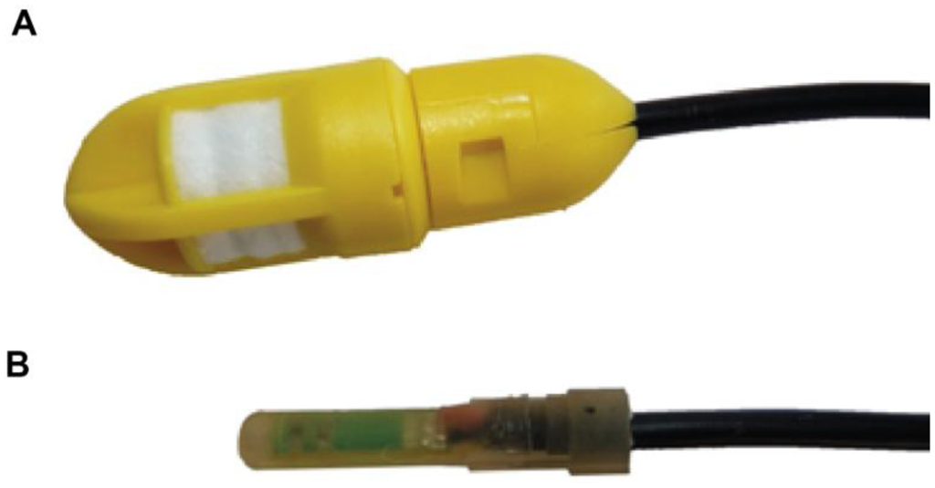 (A) PlantCare sensor (diameter 15 mm). (B) PlantCare sensor without box and synthetic felt.