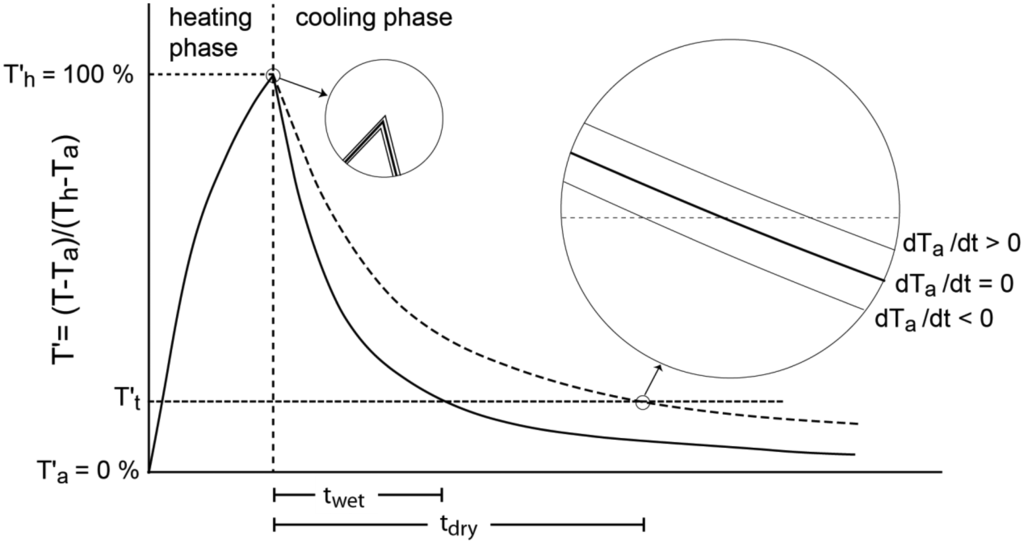 The differences between sensors are usually not small and there is an influence of the substrate on the measurements under dry conditions. Both problems can be minimized by normalization of the signal by two well-defined conditions: water saturated and air dried. The dimensionless cooling time tn is formulated in equation 1 as a function of the maximum cooling time td (air dried) and the minimum cooling time ts (water saturated):