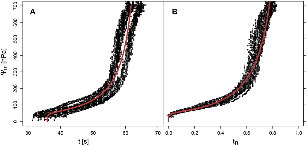 (A) Calibration of the PlantCare sensor signals in a pressure plate apparatus (circles) expressed as absolute cooling time t fitted with Equation (3) and (B) as normalized cooling time tn fitted with Equation (2). The threshold temperature was 18% (Figure 2).