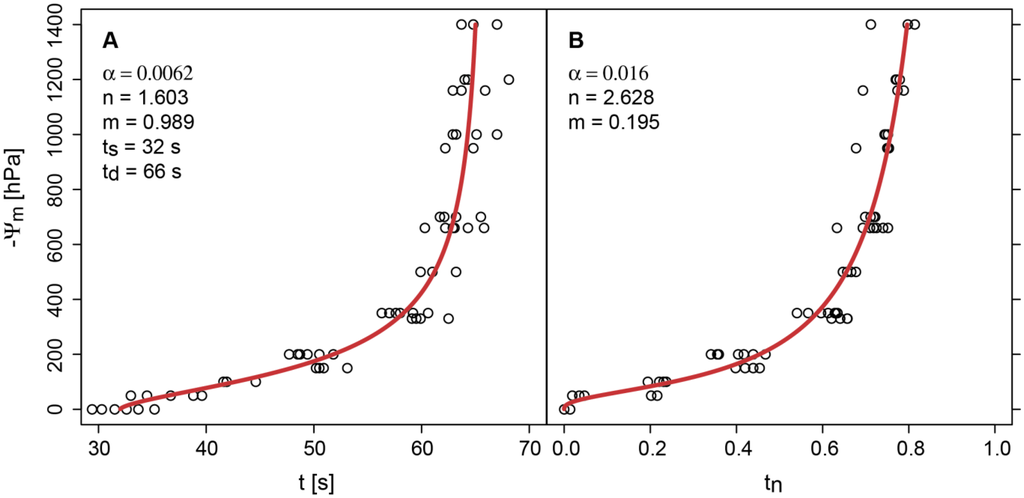 To fit the absolute cooling times t the water retention curve of van Genuchten [11] could be written as follows based on Equations (1) and (2):