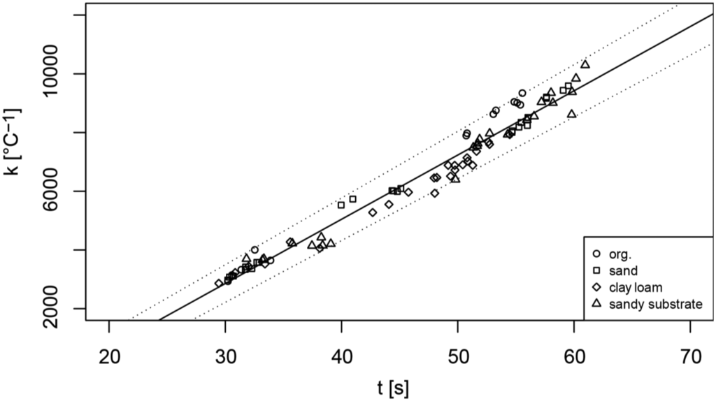 Correction factor k as a function of the cooling time t for a threshold value of 18% (Figure 2) and the 4 substrates (organic substrate, sand, clay loam and sandy substrate).
