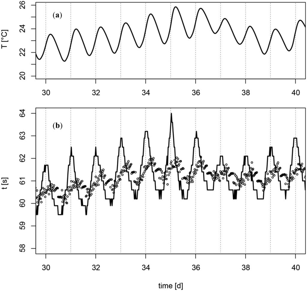 The application of the proposed correction on measurements in an irrigated apple plantation shows a remarkable reduction of the amplitude of the fluctuation (Figure 6), but the correction causes also a phase shift. Initially the oscillation of t was almost in phase with the oscillation of dTa/dt and after the correction the oscillation of t was in phase with the oscillation of the ambient temperature Ta. The remaining fluctuation of t after the correction for the temperature changes could be addressed to daily variations of the matric potential due to evapotranspiration, capillary hysteresis and a weak T dependence ([13,14]). Another and even simpler method for correction for the influence of T fluctuations would be a direct adjustment of the temperature by measuring the temperature gradient immediately before each measurement cycle (Figure 2).