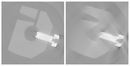 Topical works express the reconstruction quality of a voxel by gradient based values [–] or Gibbs priors []. All these approaches exploit the densities of neighbouring voxels only. They are unsuited to detect bad areas in reconstructions from a limited angle range, since these areas are not remarkably sharp. Others evaluate a voxel by the difference between its reconstructed density and the next a priori known material density. In this way, test objects that consist of one solid material can be reconstructed [,]. When the test object is composed of several materials, the quality measure fails, because some voxels get a material density by mistake. For example, the test object in Figure 1 (on the right) is blurred. Voxels in the air near the steel screw wrongly yield the density of aluminium.