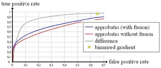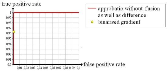 In Figure 10, the Receiver Operating Characteristic that follows from approbatio without fusion is pictured in red. The evaluation via difference yields an identical curve, i.e., both quality measures are suited to evaluate the reconstructed test object. The yellow dot results from determining with binarised gradient. The false positive rate equals zero. The true positive rate amounts to 96.3%. Compared with the other quality measures, the binarised gradient is marginally worse, but for safety reasons a low false positive rate is more important than a high true positive rate. Hence, each quality measure reliably evaluates the test object.
