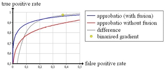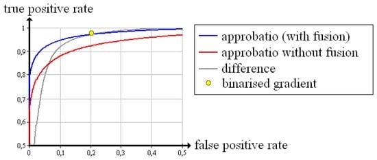 Equally, Figures 11, 12 and 13 summarise the Receiver Operating Characteristics measured with the “screw nut”. It becomes visible that the true positive rate of each quality measure is reduced by the limitation of the angle range and noise. Yet the difference turns out to be less suitable for evaluation: There is no threshold λ that reaches a false positive rate of zero (apart from the maximum threshold, which also produces a true positive rate of zero). The binarised gradient outputs a high false positive rate that is 65.3% in case of 90°, 38.0% for 130° and 19.8% for 150°. Approbatio without fusion keeps a false positive rate of zero while the true positive rate amounts to 22.9% (90°), 52.5% (130°) and 66.2% (150°). The fusion actually improves the evaluation. The true positive rate increases up to 26.2% (90°), 66.1%(130°) and 79.7% (150°).