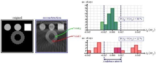 Test object and its reconstruction on the (left). Histograms of projection error on the (right) measured at the position of the “good” reconstructed voxel g and the “bad” reconstructed voxel b.
