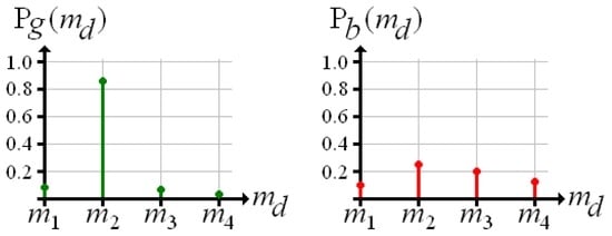 Now, for each voxel there is one probability value per material density. Exemplarily, Figure 3 shows the probability distributions over material density measured at the positions of voxel g and voxel b (according to Figure 2). For the “good” reconstructed voxel g, the material density of the hollow sphere achieves a high probability, whereas the probability of any other material is low. In the distribution of voxel b there is no distinct maximum.