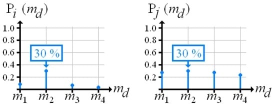 The discrete probability distribution over material density already retains all the information required for determining quality Yet for practical applications, it is more advantageous to handle one numerical value that expresses the reconstruction quality The maximum of the distribution seems to be suitable, but it does not include conflicts, as demonstrated in Figure 4. Here, two different voxels i and j hold a maximum probability, which is 0.3 at material density m2. For voxel i this maximum stands out; the insertion of any other material produces extremely low probabilities. In contrast, for voxel j each material has approximately equal probabilities.