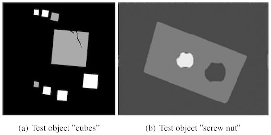 The experiment deals with two different test objects, both situated in cone beam geometry. The first test object consists of eight cubes in which one cube is cracked (pictured in Figure 6(a)). We briefly name it “cubes”. From this test object, 200 X-ray images spanning 360° are available. Each image has the size of 200 × 40 pixels. The reconstructed volume contains 200 × 200 × 40 voxels. We executed the iterative reconstruction algorithm SART [] up to the 12th iteration step. After each iteration step, we evaluated the whole volume providing the three materials of which the test object consists: m1 = 0.0, m2 = 0.2, m3 = 0.4.