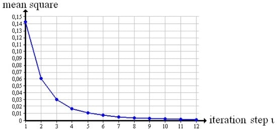 Then, we define an ideal quality measure demanding k0 = 0 and k1 = 1, and observe the quadratic mean E [(as − ks)2] of all voxels in the reconstruction of the “cubes” from iteration step ι = 1 to iteration step ι = 12. By this we analyse the convergence of our evaluation method in Equation (13).