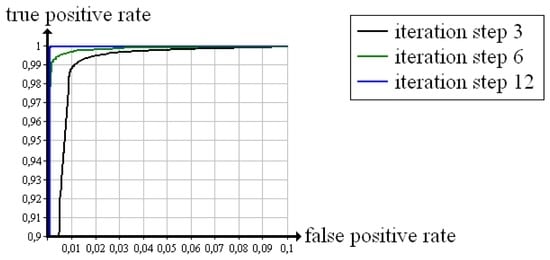 to binarise approbatio as on the basis of a varied threshold value λ (and 0 ⩽) λ ⩽ 1;. The true positive rate P (n1 ∣ k1) results from counting all voxels that fulfil the conditions in Equations (12) and (15). Similarly, the false positive rate P (n1 ∣ k0) results from counting all voxels that fulfil the conditions in Equations (11) and (15). Using these rates, we recorded the Receiver Operating Characteristics of the “cubes” in Figure 9. From iteration step 3 to iteration step 12, the curve moves to a higher true positive rate. The evaluation becomes more and more reliable. In the 12th iteration step, the curve is nearly ideal.