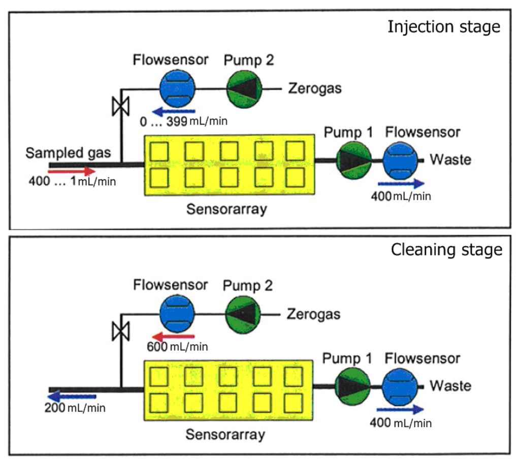 Schematic diagrams of the gas flow of PEN3 during the electronic nose measurements.
